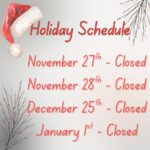 Nov 25th we will be closed for Thanksgiving Dec 24th we will be closed for Christmas Dec 31st we will be closed for New Years Day